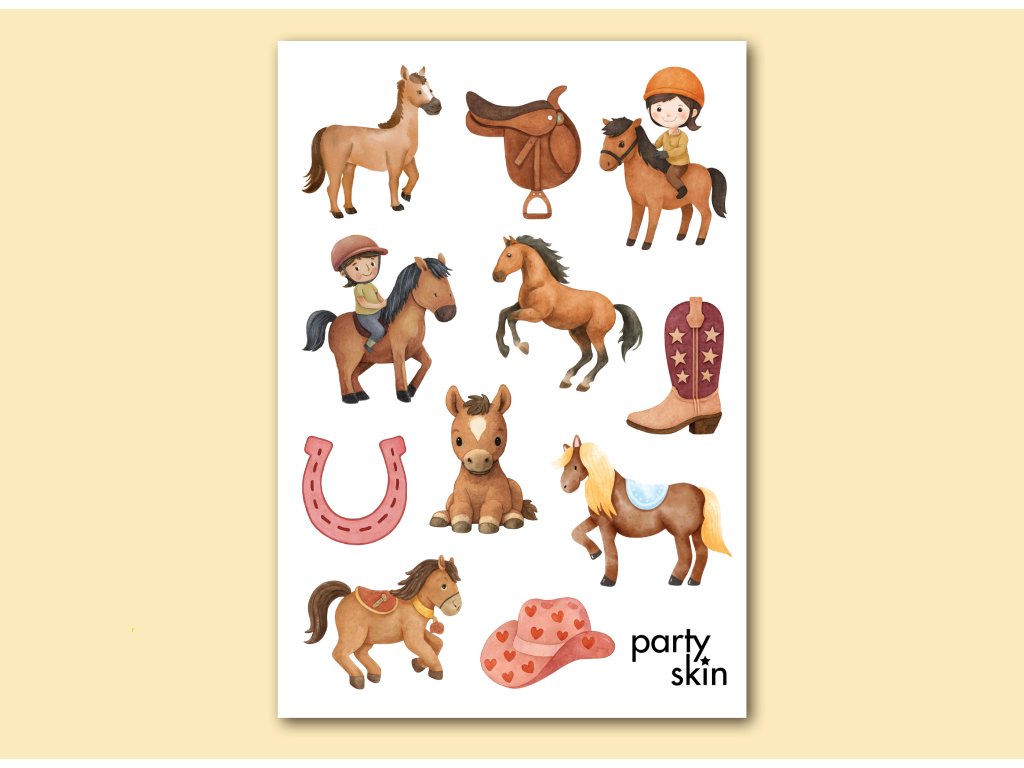 Dětské tetování s motivy koní A6 je oblíbené dočasné tetování pro děti, které milují koně, poníky a jezdecký svět. Dočasné tetovačky s koňmi jsou ideální jako drobný dárek pro děti, malá odměna, aktivita na narozeninové oslavy, dárek do školy či školky nebo součást dětských balíčků při kroužcích zaměřených na koně a jezdectví. Tetování pro děti se snadno aplikuje pomocí vody, dobře drží na pokožce a lze jej jednoduše odstranit. Motivy koní jsou vhodné pro kluky i holky a patří k nejoblíbenějším dětským motivům v České republice.