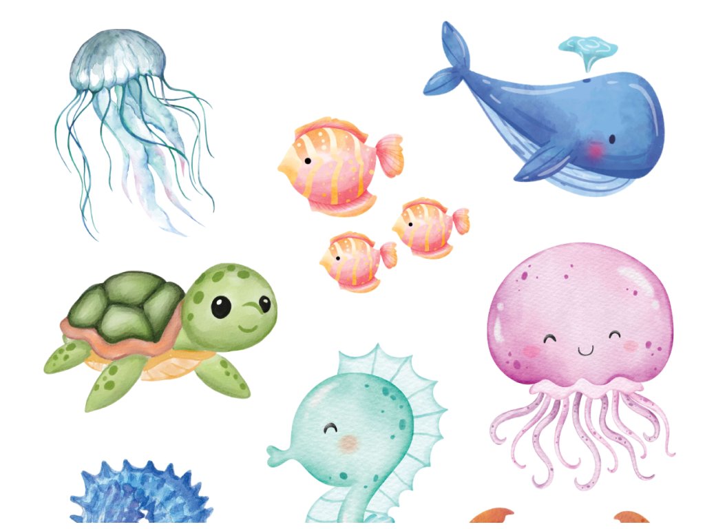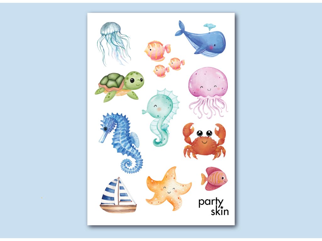 Set dočasného tetování se zvířátky z podmořského světa, kterým vykouzlíte dětem úsměv na tváři na oslavě narozenin, nebo jen tak.