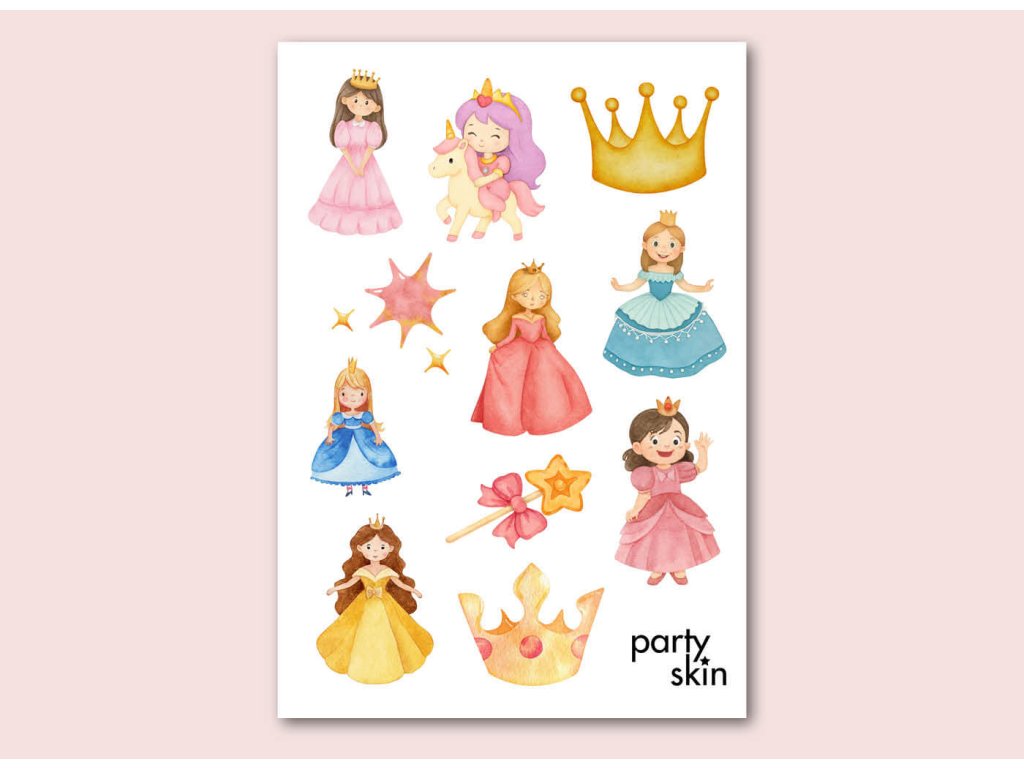 Dětské dočasné tetování princezny (A6) je malá, ale ověřená zábava na každou dětskou akci. Motivy princezen děti milují – hodí se na dětské narozeniny, oslavy ve školce, karneval, přespávačky i jako drobný dárek do balíčku pro hosty. Arch ve velikosti A6 je praktický: snadno se rozdělí mezi děti, nezabere místo a je ideální i jako doplněk k výzdobě.