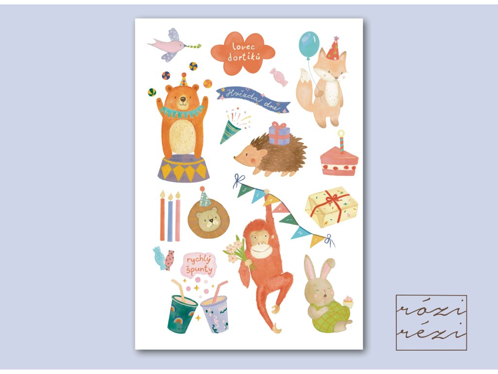 Dětské narozeninové dočasné tetování A5 – zvířátka je rychlá a jednoduchá zábava, která funguje na každé dětské oslavě. Roztomilé motivy zvířátek, která slaví narozeniny, se hodí pro kluky i holky a skvěle doplní tematickou výzdobu, program i fotky. Arch ve formátu A5 je praktický: snadno ho rozdělíte mezi děti a využijete ho jako drobný dárek pro hosty, odměnu do soutěží nebo aktivitu „na stole“, která zabaví během pár minut.