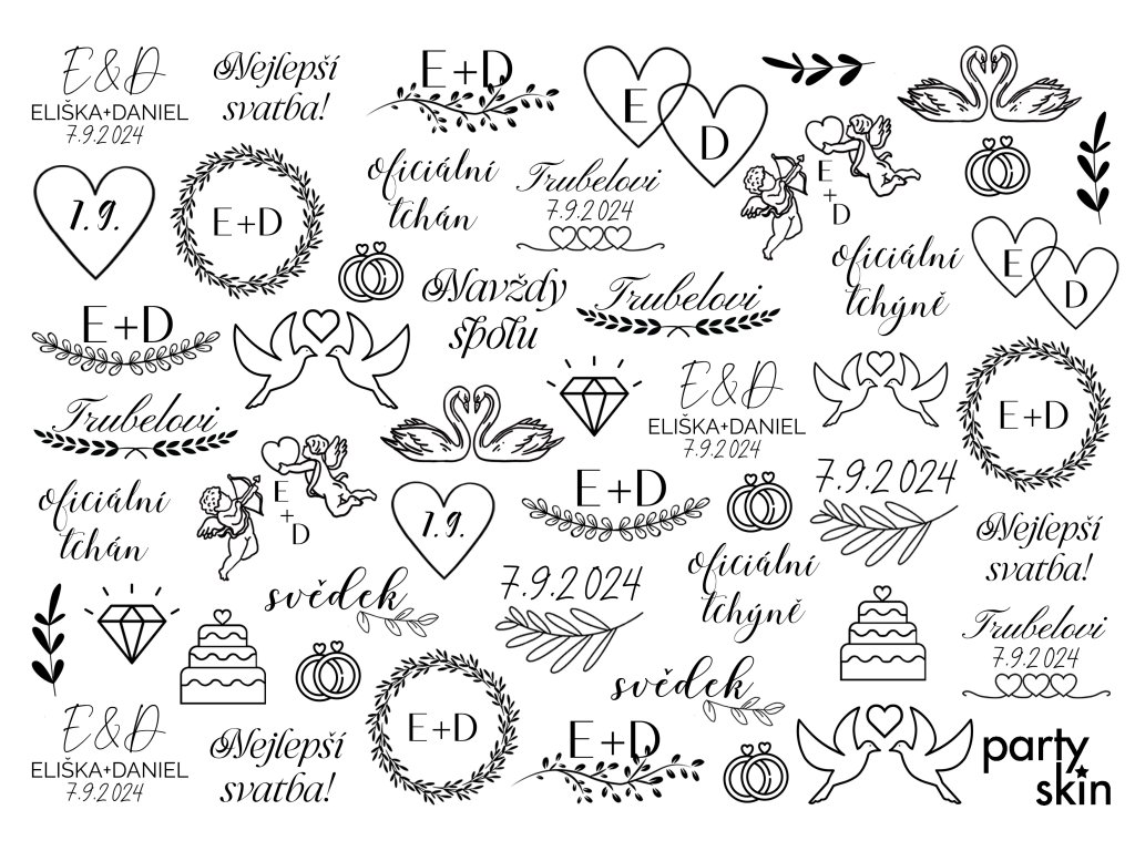 svatební tetovačky pro skupinu, dočasné tetování na svatební párty, svatební set tetování, designové tetovačky pro svatbu, zábava na svatební hostinu, tematická svatba s tetováním, svatební originální výzdoba, svatební oslava se stylem, party doplňky na míru, set dekorací pro svatebčany, netradiční svatební zábava, kreativní doplňky pro svatbu, svatební radovánky s tetováním, svatba plná překvapení, zábava na míru pro svatební den, dočasné tetování jako dekorace