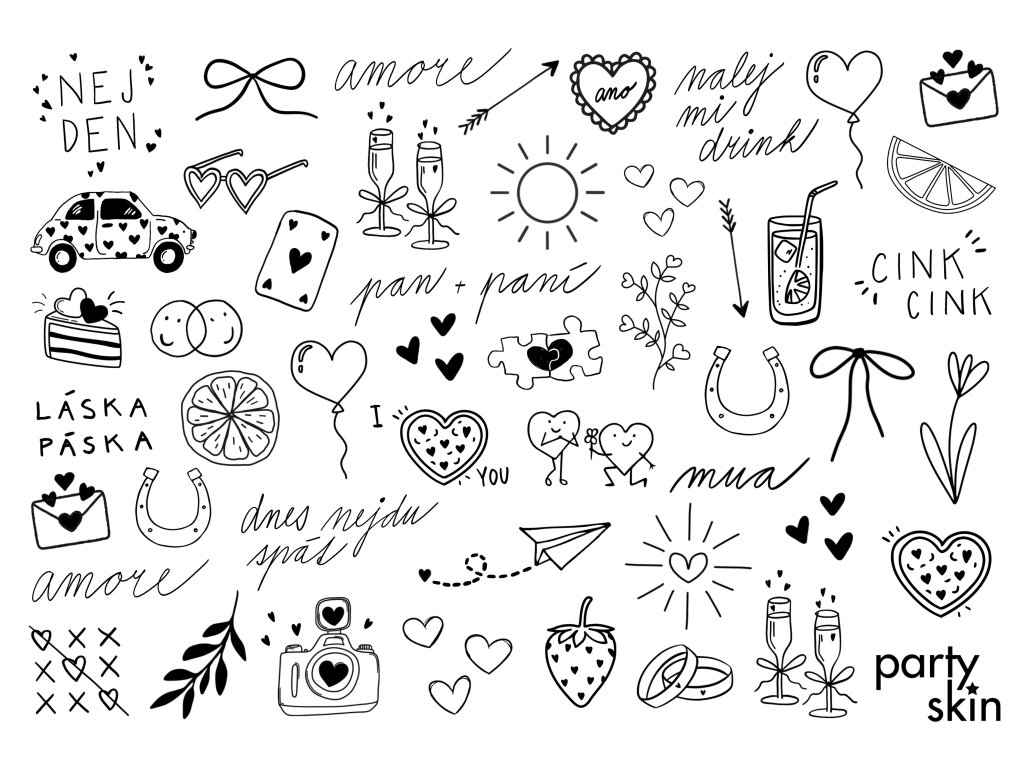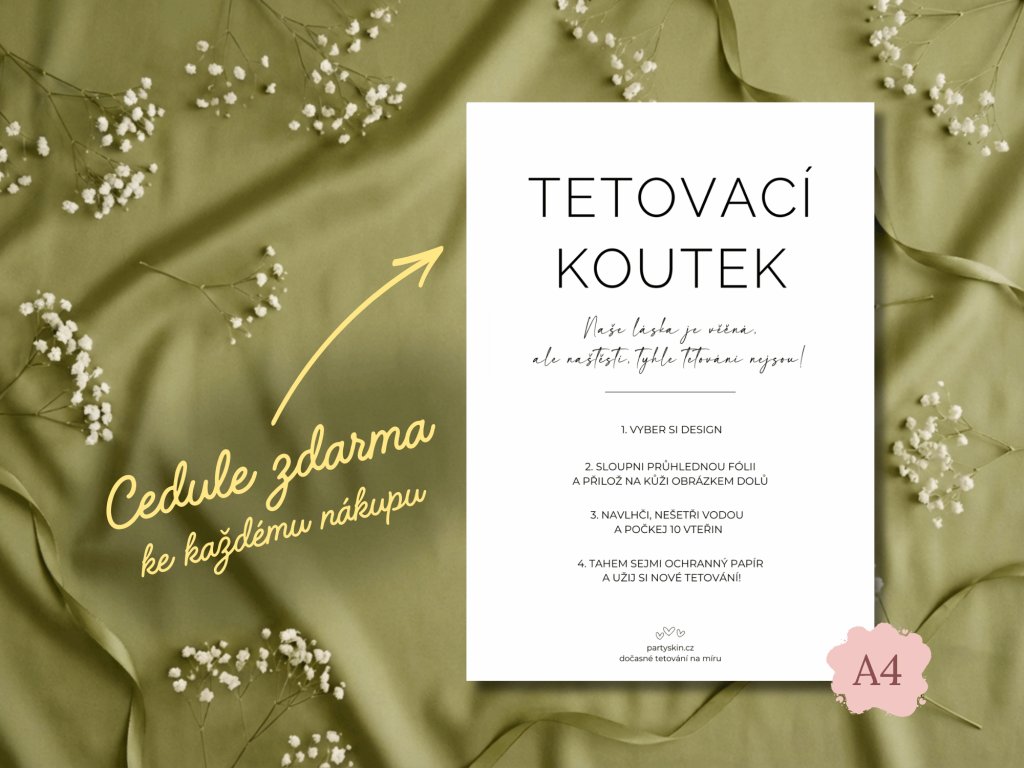 Svatební tetovačky A4 jsou jednoduchý detail, který spolehlivě rozjede atmosféru – hlavně když z nich uděláte svatební tetovací koutek. Hosté si během dne vybírají motivy, lepí si je pro radost a na fotkách to pak vypadá sjednoceně a „svatebně“, aniž by to působilo přehnaně. Jemné motivy sedí nevěstě, družičkám i hostům a A4 formát je ideální, když chcete potetovat víc lidí jedním archem.