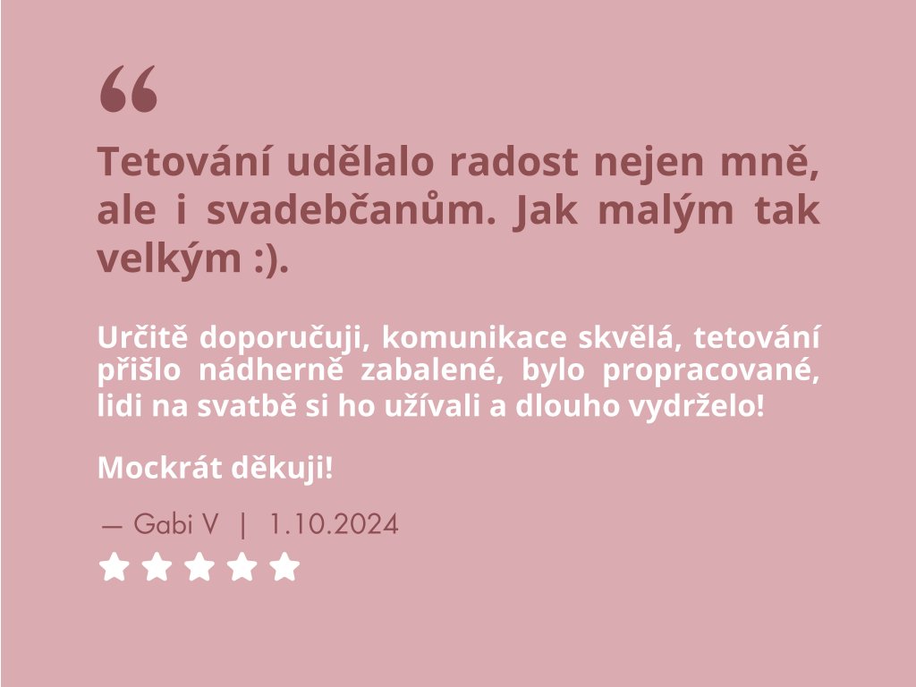 Doručení rychlé, komunikace ohledně návrhů bezvadná a otevření balíčku?! Byla jsem tak mile překvapená, že to ani nedokáži popsat :D nejvíce potěšil milý vzkaz a hlavně skvělé provedení všech tetovaček :) Děkuji!